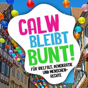 „Calw bleibt bunt“ lädt alle zivilgesellschaftlichen und überparteilichen Organisationen, Verbände, Kirchen, Religionsgemeinschaften, Vereine und Parteien sowie Einzelpersonen zum Mitmachen ein.